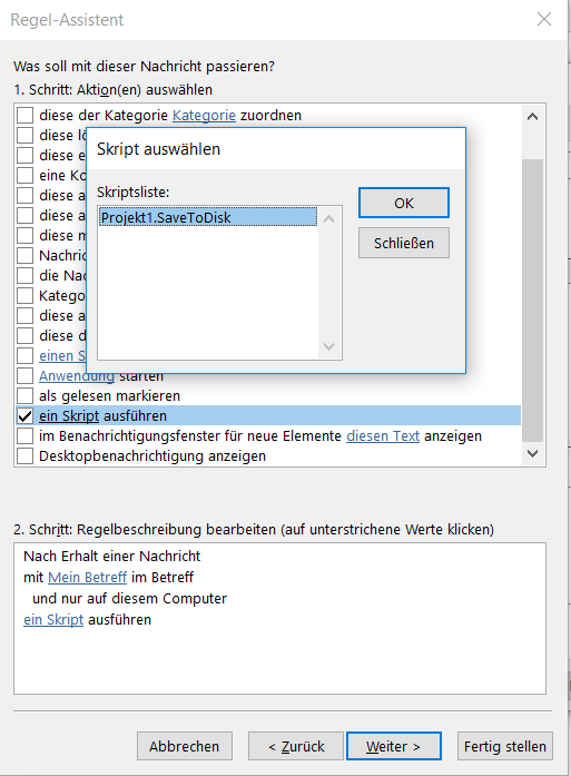 Auf OK und weiter klicken. Die Aktion Skript ausführen auswählen und die vorher eingefügte Sub auswählen.